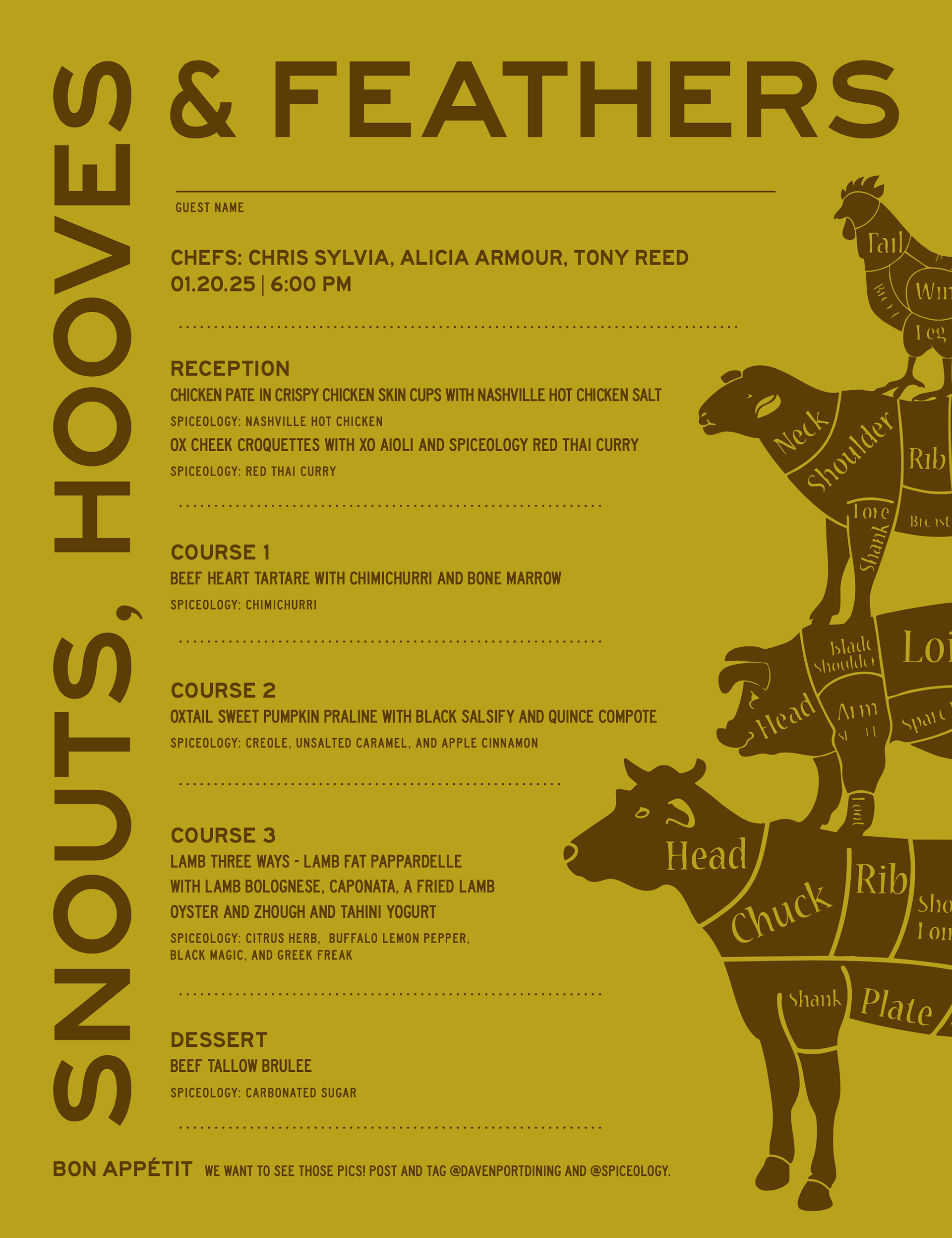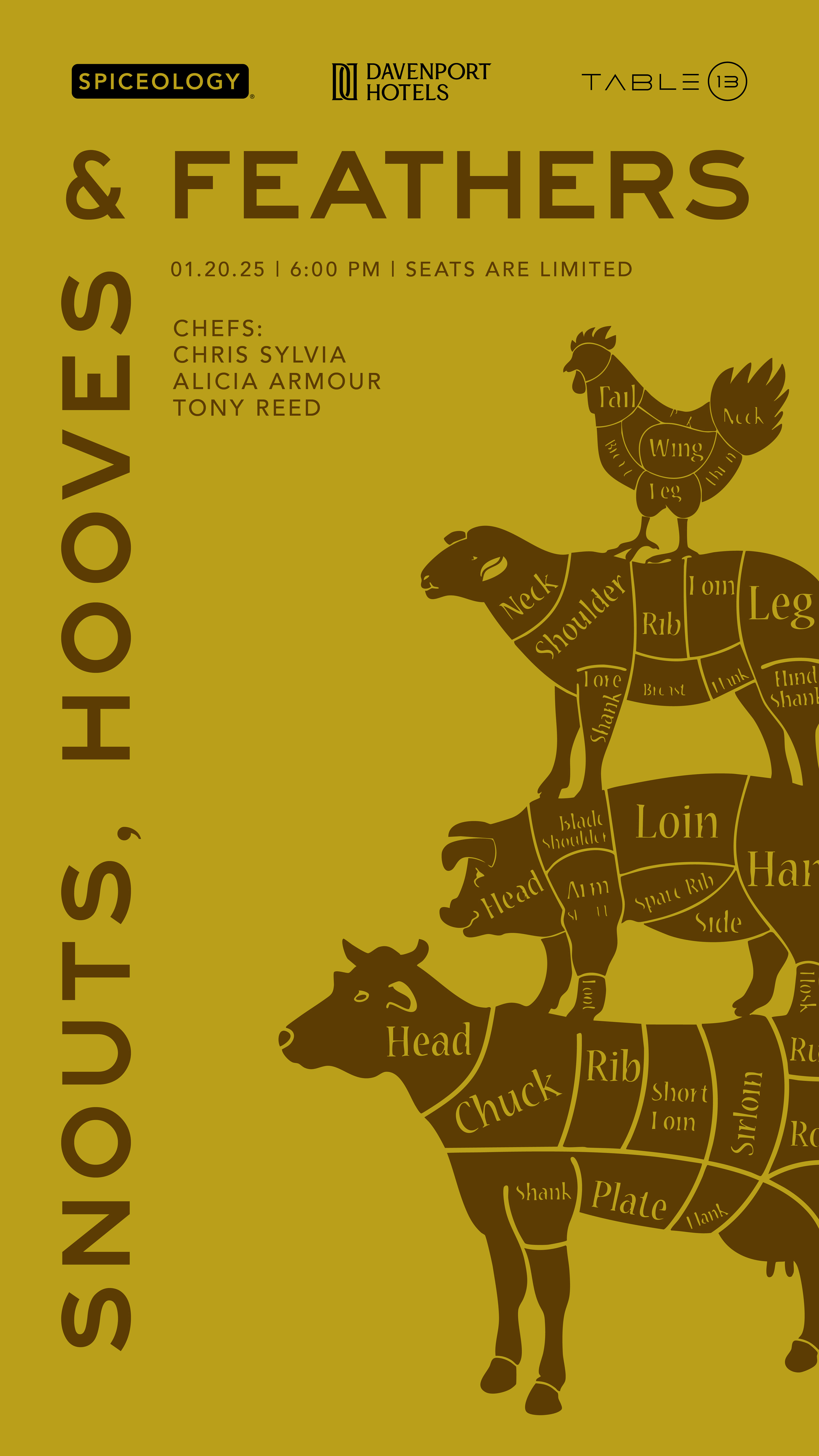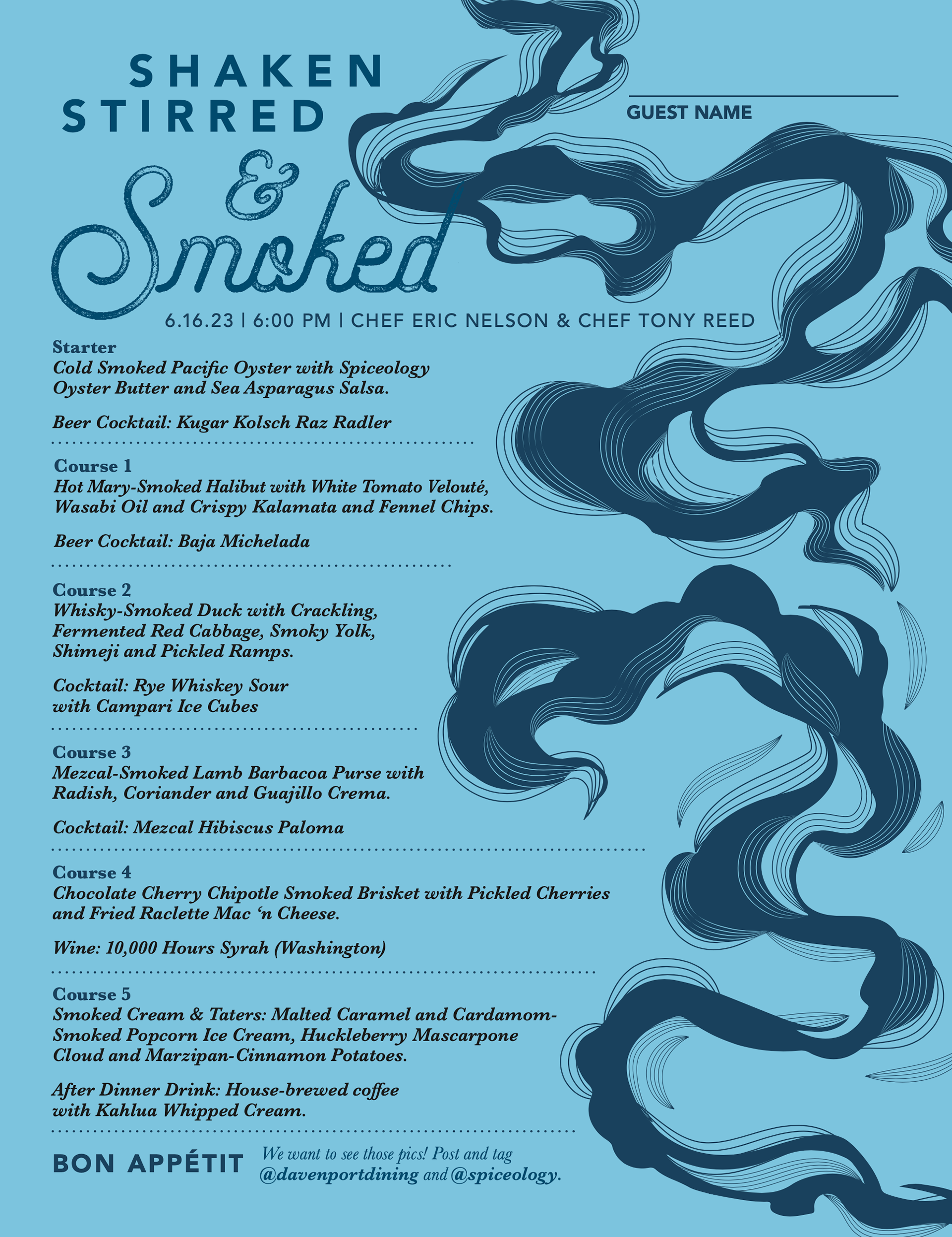 Spiceology and Davenport Hotels team up to deliver these special occasions, where guests come together to enjoy good food and great company. Every dish tells a story, where thoughtfully crafted flavors bring people together. The theme is different for each dinner, so the designs reflect the uniqueness of each experience.