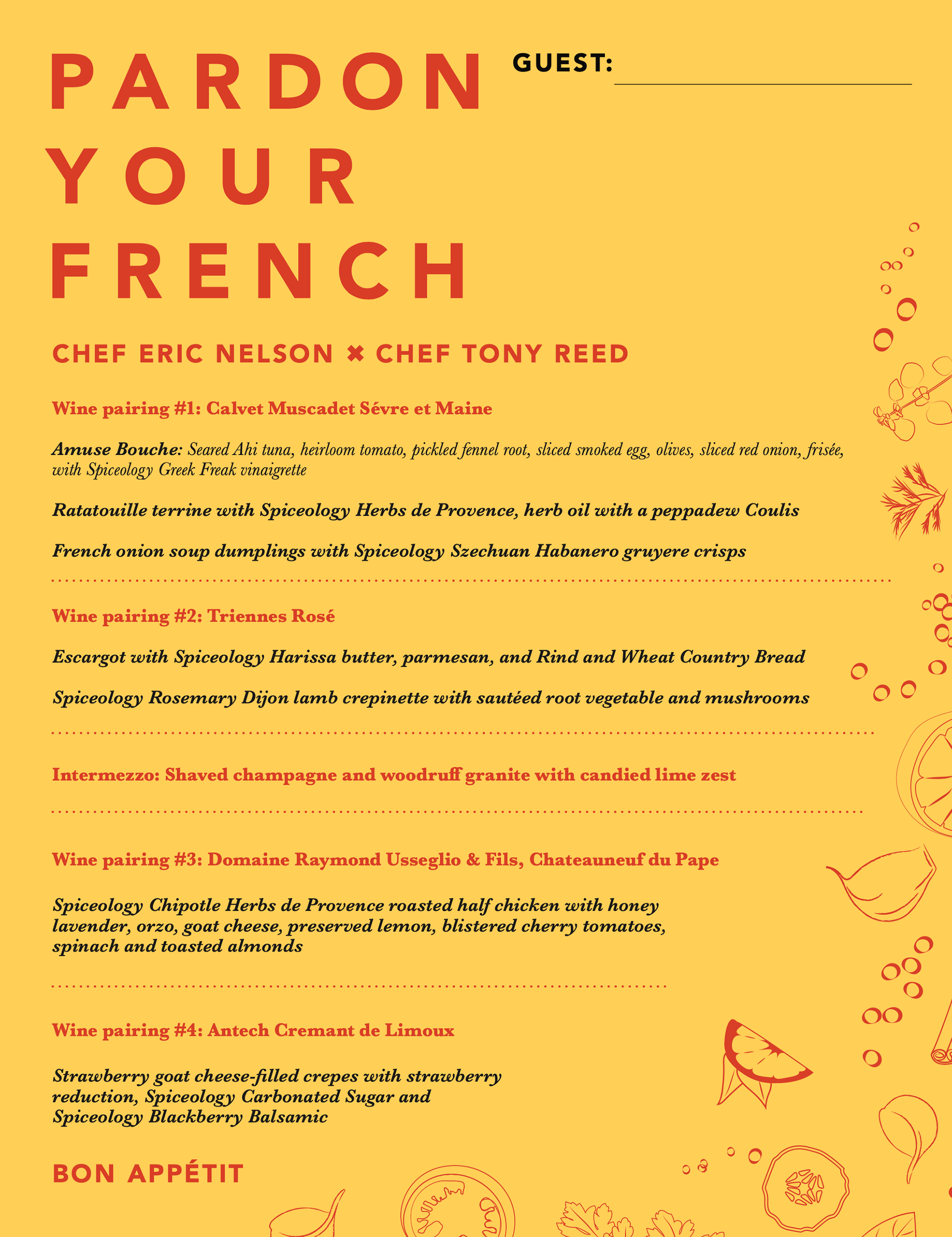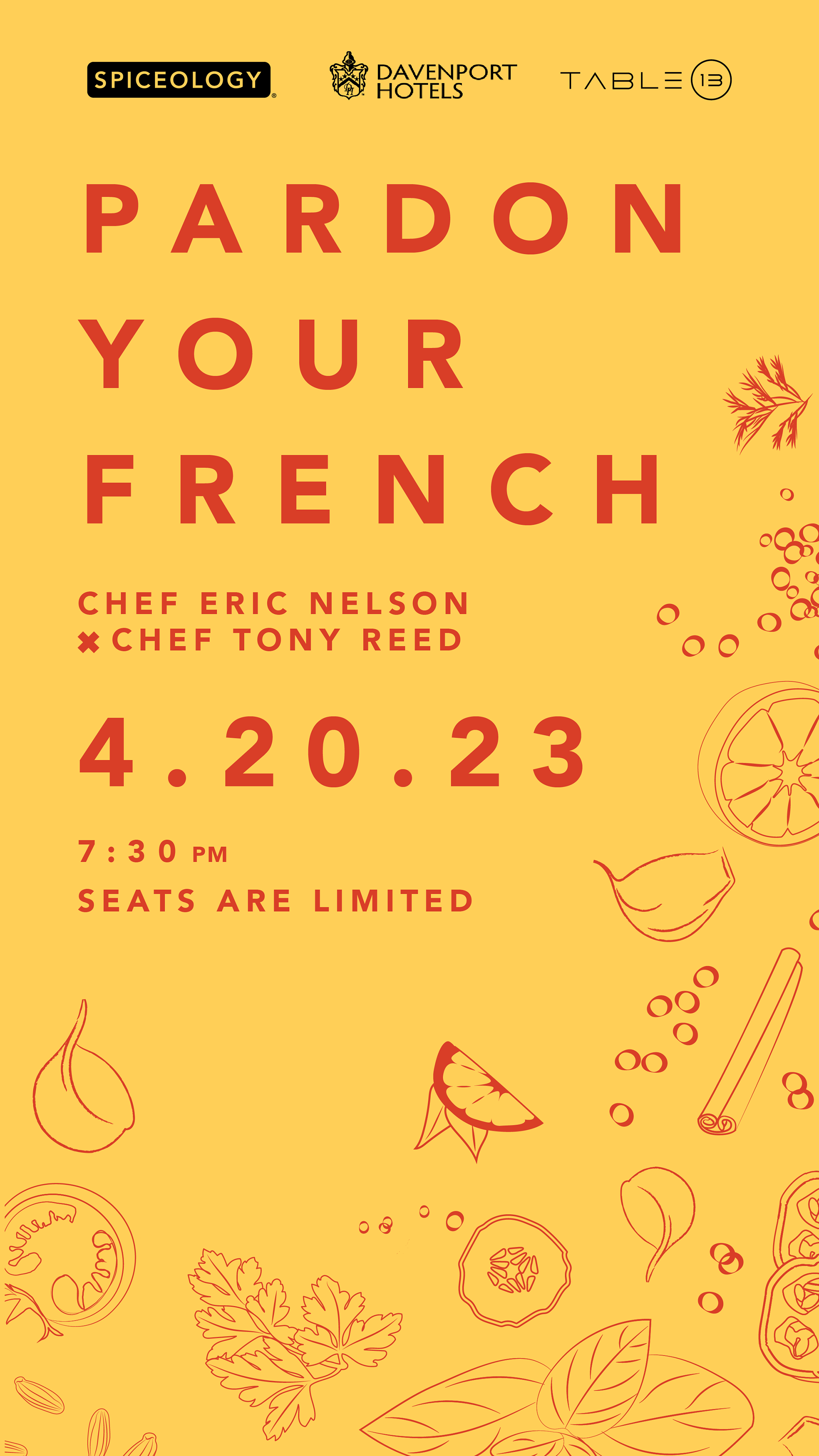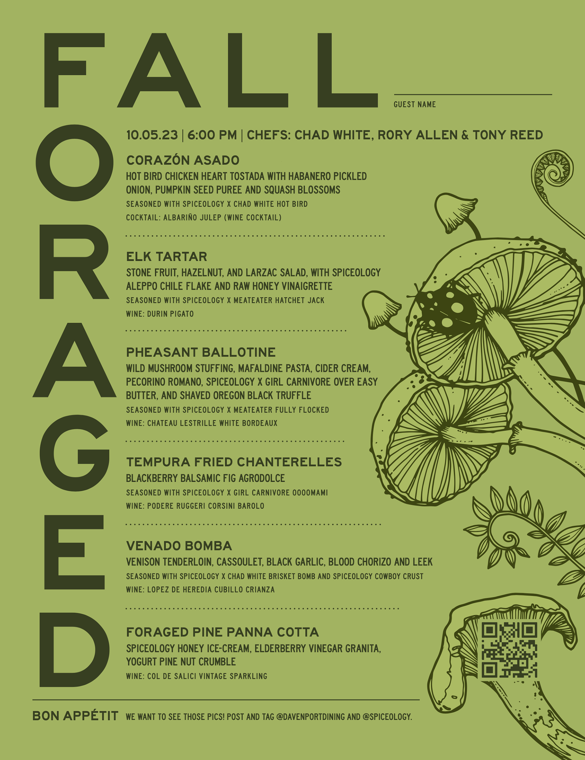 Spiceology and Davenport Hotels team up to deliver these special occasions, where guests come together to enjoy good food and great company. Every dish tells a story, where thoughtfully crafted flavors bring people together. The theme is different for each dinner, so the designs reflect the uniqueness of each experience.